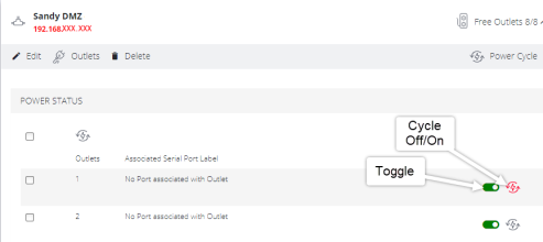 After the PDU has been created and configured, PDU operation is simple. For any PDU that has Monitoring set to Enabled, the Toggle on/off switch will power-on or power-off the PDU, and the Cycle button cycles the PDU through a power-down and power-up cycle.