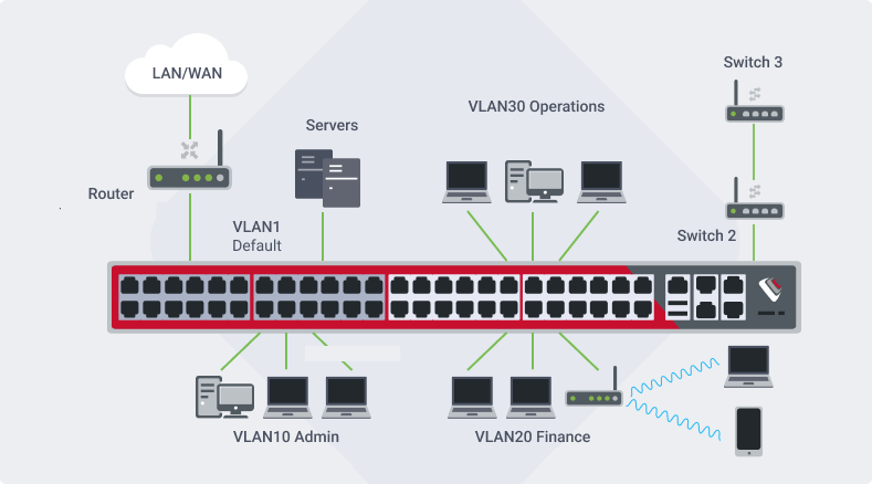 VLANs allow you to make separate broadcast domains on a switch. The broadcast domains can associate with one another with the help of a Layer 3 device such as a router. A VLAN is mainly used to form groups among the hosts regardless of where the hosts are physically located. In a bigger network, the configured VLANs with interfaces assigned as access and trunk ports on switches could look like this: