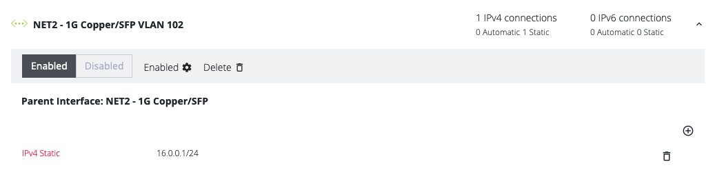 The following example shows VLAN 102 on the NET2 trunk port, with 16.0.0.1 address assigned: