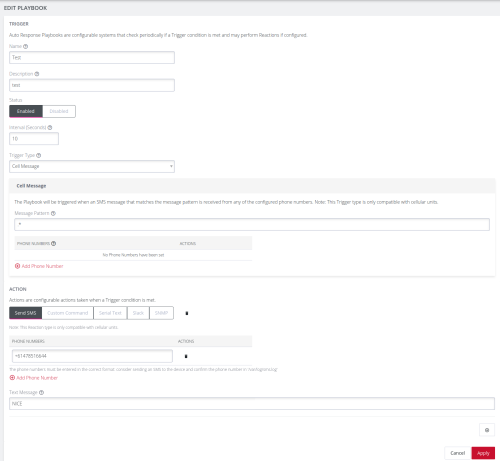 - Cell Message: Triggered when an SMS message that matches the user-defined message pattern. Cellular units only.