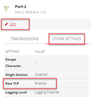 Note: Raw TCP access is disabled by default on Opengear devices. Users must enable Raw TCP access on a serial port through the WebUI, Config CLI or ogcli.