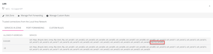 Note: tcp_serial service must be manually added to relevant firewall zones after Raw TCP has been enabled on a port.
