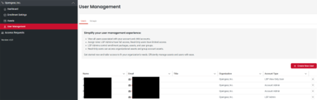 The User Management tab allows you to invite new users to the Opengear Customer Portal, Create new custom groups for permissions, and more.