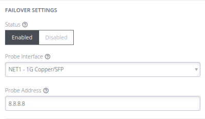 | Enabled | Disabled | Failover mode | Failover detection is enabled on the selected “probe” interface. The network or cellular interface remains in a down state with no network configuration. When failover is initiated, the network or cellular interface is started and configured. If a default route is installed on the interface, it takes precedence over the default route on the failed “probe” interface. Outbound network traffic (e.g. VPN client tunnels, SNMP alerts) are established or re-established over network or cellular connection during failover. The advantage of this mode is the secondary connection is completely inactive during normal operation which may be advantageous where the goal is to keep the interface off the Internet as much as possible, e.g. a cellular plan with expensive data rates and no carrier-grade NAT. |