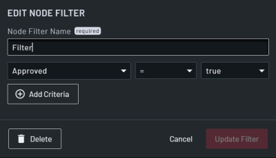 The following example image shows the EDIT NODE FILTER dialog, but the edit and new dialogs are the same for all filter types.