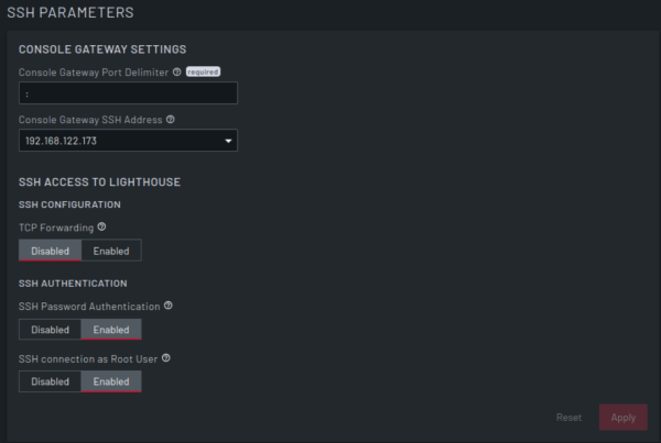 | SSH Access to Lighthouse | TCP Forwarding | Select whether to Enable or Disable. When set to Enable, allows SSH clients to forward TCP traffic through the secure SSH tunnel. Used primarily for port forwarding and SSH "jump" connections. Does not interact with firewall forwarding rules. This is disabled by default. |