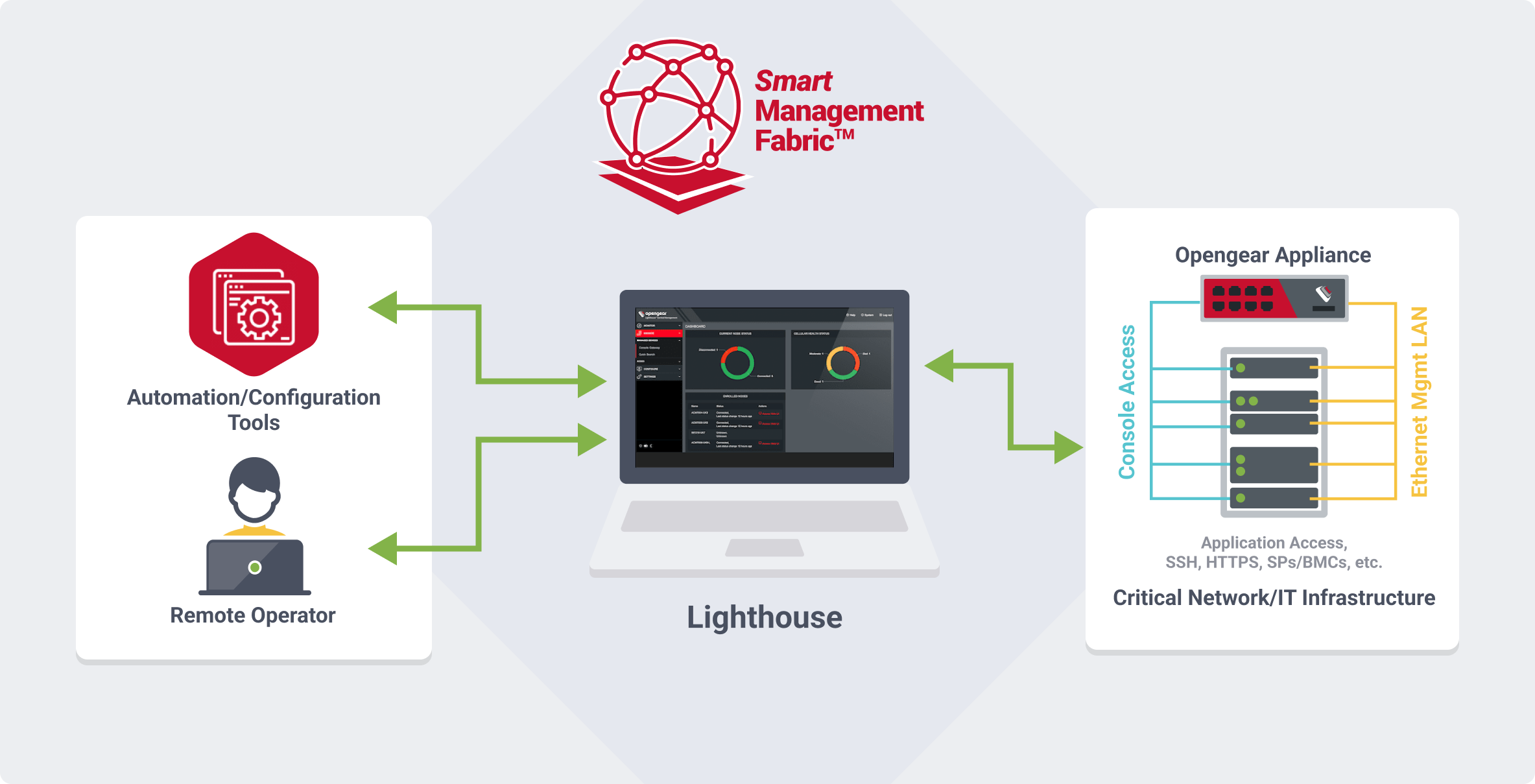 Smart Management Fabric allows you to create an enterprise grade Open Shortest Path First (OSPF) solution for network connectivity, configuration and troubleshooting devices connected to supported nodes on Lighthouse, wherever they may be.
