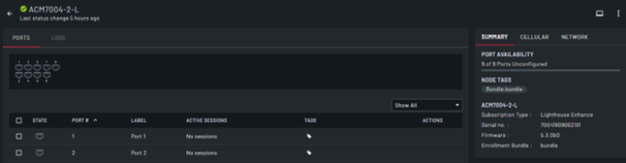 | Ports | Displays all the configured and unconfigured ports on the node. Configured ports display green. |