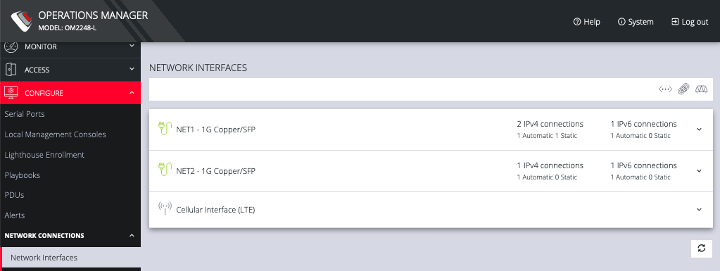To disable or delete interfaces, use the controls on the expanded section on the CONFIGURE > Network Connections > Network Interfaces page.