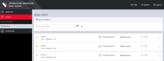 In the Navigation Bar on the left side, navigate to the ACCESS > Serial Ports page. The Serial Ports page displays a list of all the serial devices, including the links to a Web Terminal or SSH connection for each.