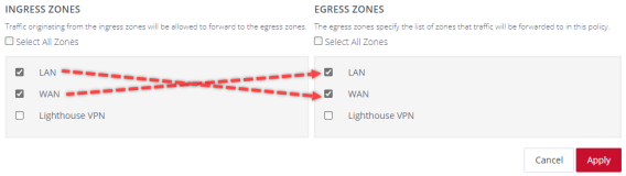 Click to check the boxes for each Ingress and Egress zone that is to be included in this policy. You can configure traffic in both directions by selecting both zones in the Ingress and Egress as in indicated by the red arrows in the image below: