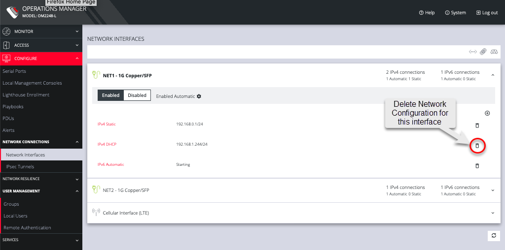To disable or delete interfaces, use the controls on the expanded section on the CONFIGURE > Network Connections > Network Interfaces page.