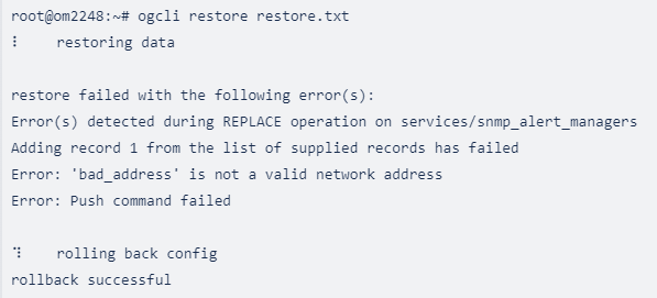 The import/restore file must follow a very specific format; deviation from format should be avoided. Comments and blank lines are allowed but any commands not starting with either ogcli or config need to be in proper heredoc format, see the below example (note the <<'END' format, this is the only heredoc marker allowed).