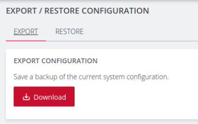 To export the system configuration, click the Download button and save this file. Sensitive data such as passwords and tokens will be obfuscated in the configuration export.
