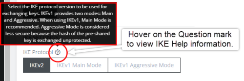 Select an IKE Protocol version to use for exchanging keys. IKEv1 provides two modes: Main and Aggressive.