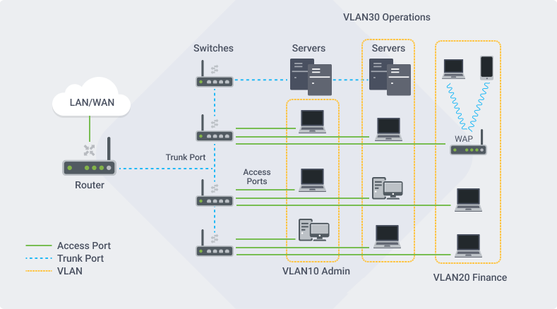VLANs allow you to make separate broadcast domains on a switch. The broadcast domains can associate with one another with the help of a Layer 3 device such as a router. A VLAN is mainly used to form groups among the hosts regardless of where the hosts are physically located. In a bigger network, the configured VLANs with interfaces assigned as access and trunk ports on switches could look like this: