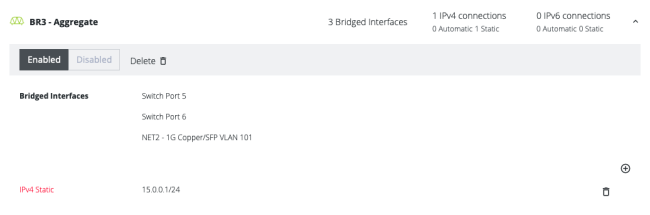 Navigate to Configure > Network Connections > Network Interfaces, then click on the New Bridge icon to create a new bridge group. Give this a name, then select the Switch Port(s) that you want to connect into this bridge group (local VLAN). Hit Create and the bridge group is created.